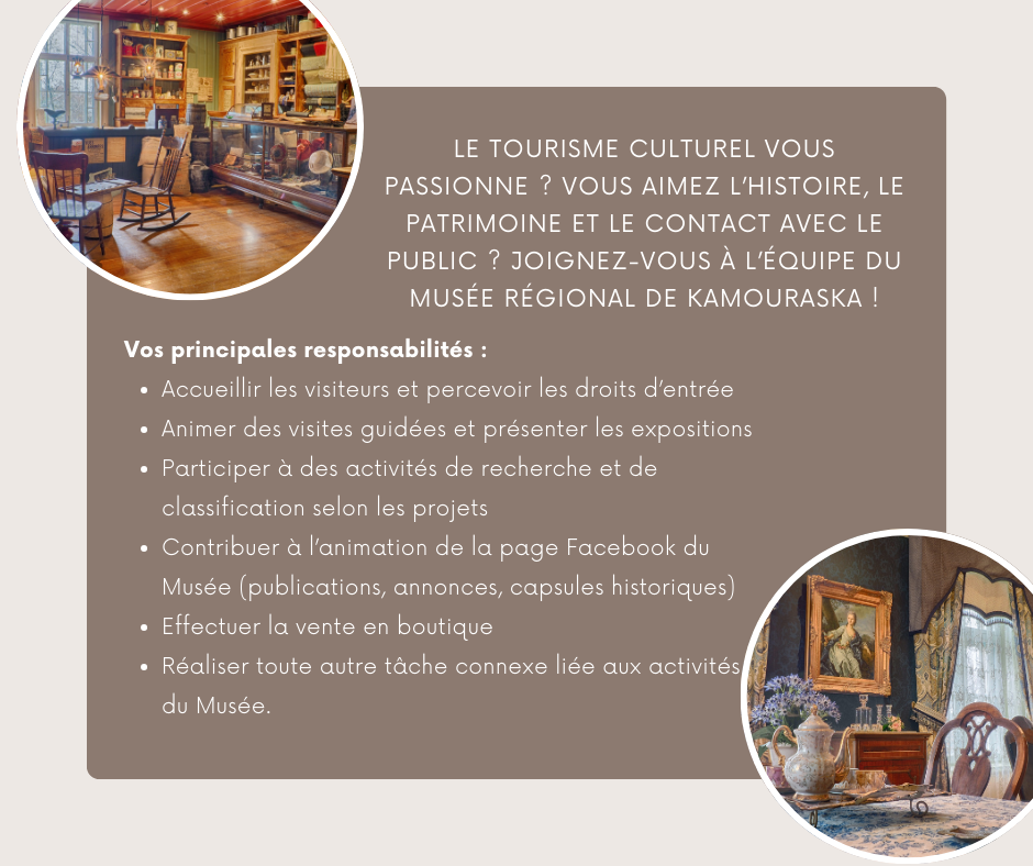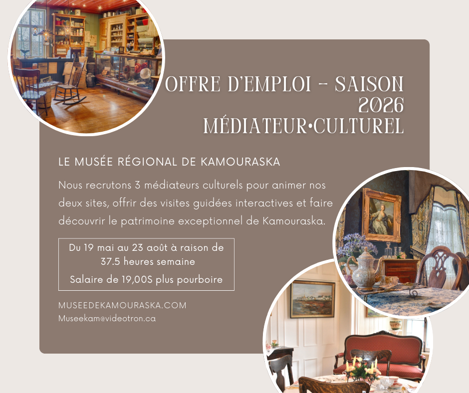 Le Musée est à la recherche de 3 médiateurs culturel et d’un responsable des collections et de la communication pour la saison estivale 2026. Les postes sont subventionnés et le candidat doit remplir certaines conditions dont : être aux études, être citoyen canadien et avoir moins de 35 ans.