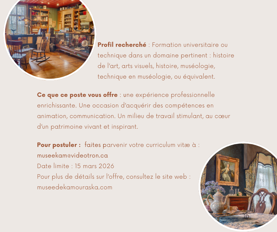 La personne retenue travaillera dans les archives et les réserves du Musée. Dans un environnement professionnel stimulant, elle aura pour mandat de donner vie aux collections en partageant anecdotes, faits historiques et détails méconnus qui témoignent de l’histoire singulière de Kamouraska et, plus largement, de la Côte-du-Sud. Ce poste combine à la fois des responsabilités liées à la gestion des collections et à leur diffusion sur les plateformes numériques du Musée. Il permettra de mettre en œuvre des compétences telles que la gestion documentaire et muséale par le traitement, l’organisation, l’analyse et la valorisation des collections. Il permettra aux étudiants en histoire, muséologie, archivistique, conservation ou histoire de l’art de développer des compétences essentielles en gestion, traitement et mise en valeur des collections muséales.